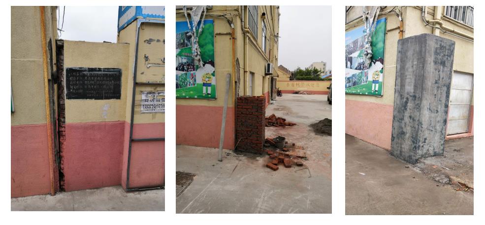 圖2: 危墻施工前、施工中、施工后