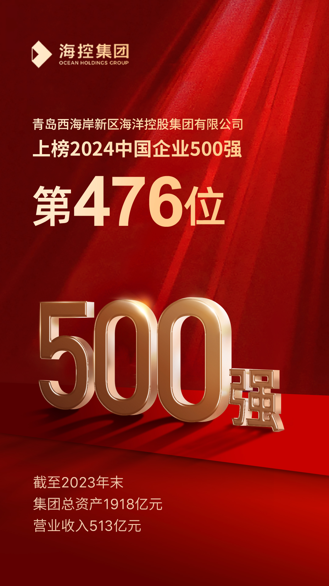 9月11日,2024中國500強企業高峰論壇在天津開幕。論壇現場,中國企業聯合會、中國企業家協會發布2024“中國企業500強”榜單,青島西海岸新區海洋控股集團有限公司(以下簡稱“海控集團”)以513億元年營收榮登榜單第476位。