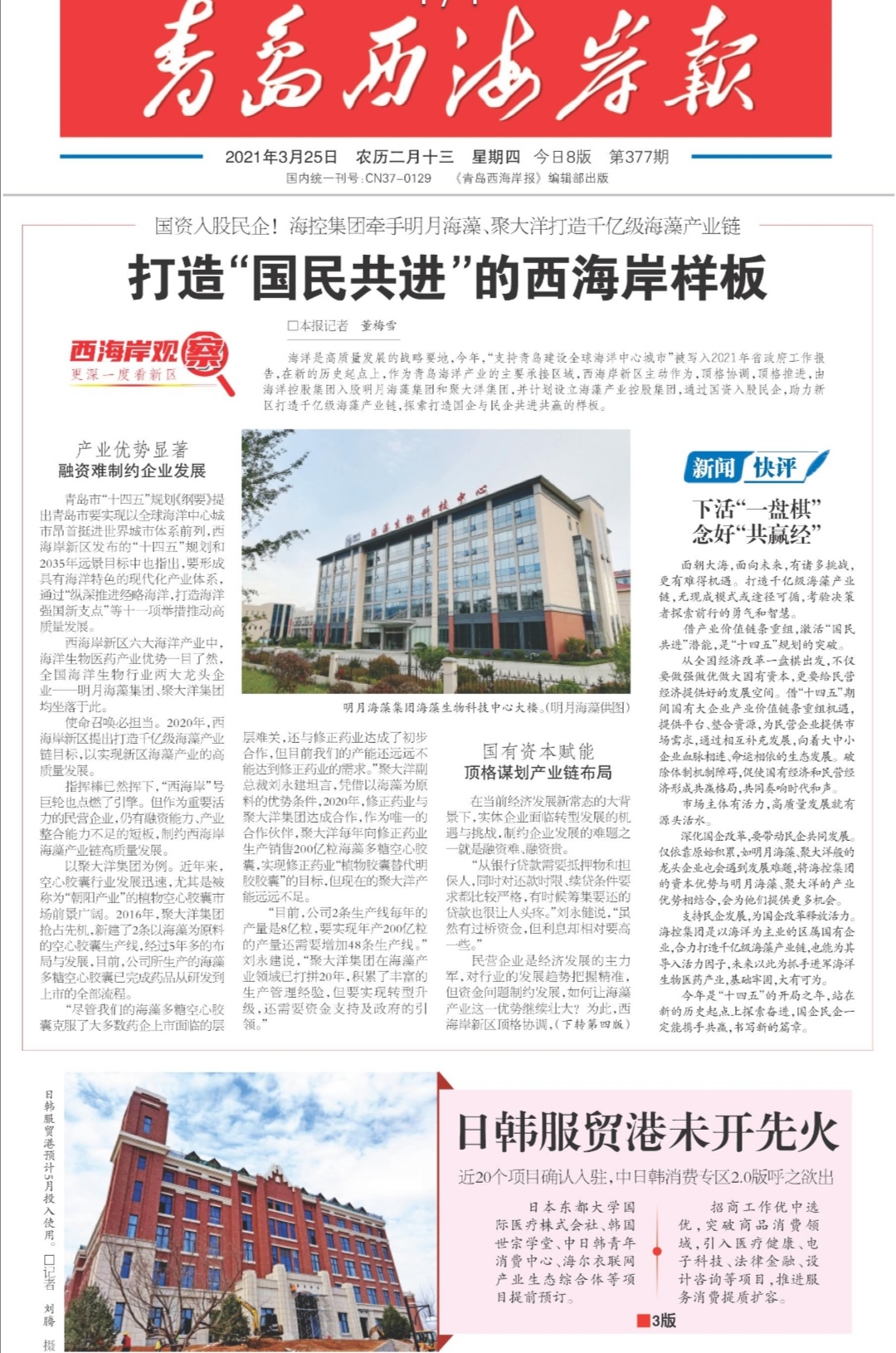 海洋是高質(zhì)量發(fā)展的戰(zhàn)略要地,今年,“支持青島建設(shè)全球海洋中心城市”被寫入2021年省政府工作報告,在新的歷史起點上,作為青島海洋產(chǎn)業(yè)的主要承接區(qū)域,西海岸新區(qū)主動作為,頂格協(xié)調(diào),頂格推進(jìn),由海洋控股集團(tuán)入股明月海藻集團(tuán)和聚大洋集團(tuán),并計劃設(shè)立海藻產(chǎn)業(yè)控股集團(tuán),通過國資入股民企,助力新區(qū)打造千億級海藻產(chǎn)業(yè)鏈,探索打造國企與民企共進(jìn)共贏的樣板。
